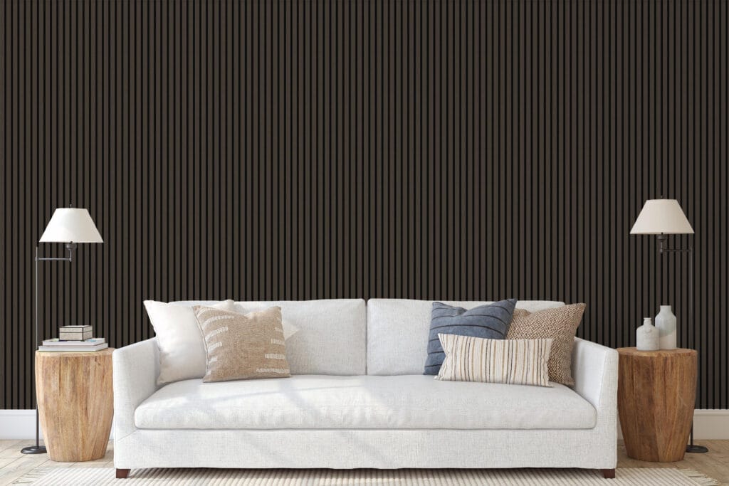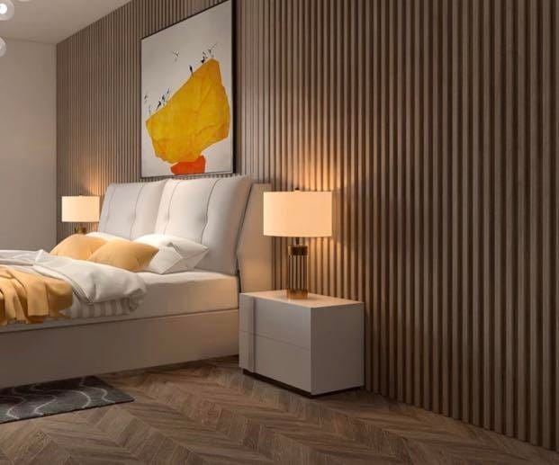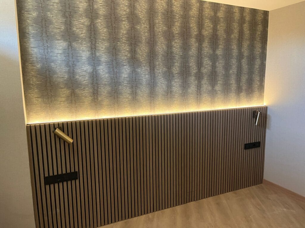 Para quienes buscan un acabado más sofisticado, ofrecemos revestimientos alistonados de PVC con un diseño contemporáneo y gran impacto visual. Además, incluimos paneles acústicos con base fonoabsorbente ignífuga, ideales para mejorar el confort sonoro, y listones de madera chapada con acabado en barniz mate, en medidas de 2700 x 325 x 21 mm, que aportan un toque cálido y refinado.